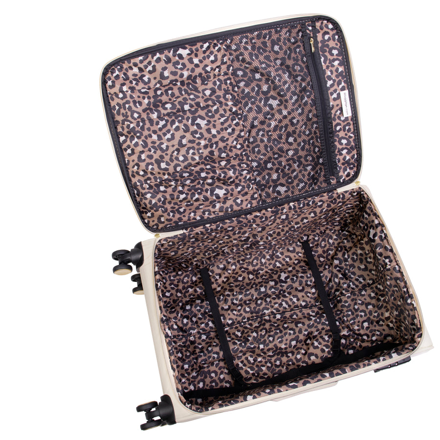 - Stylish leopard print lined interior with large zippered pocket and compression straps