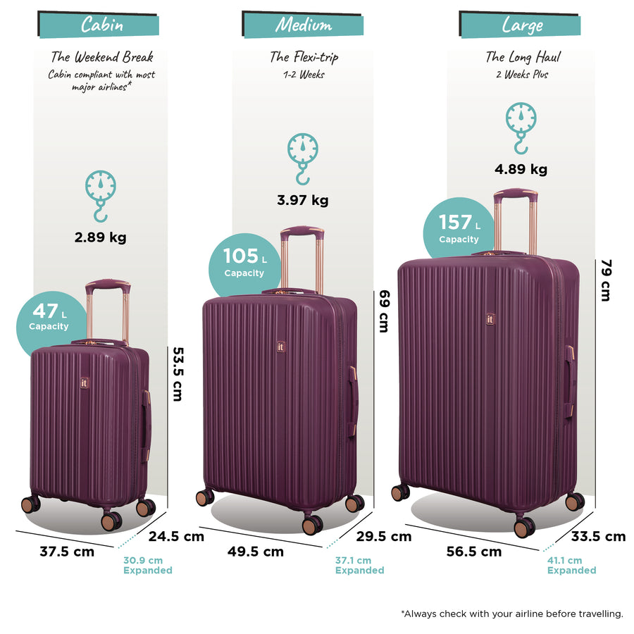 79 x 56.5 x 33.5cm + 7.6cm Exp 69 x 49.5 x 29.5cm + 7.6cm Exp 53.5 x 37.5 x 24.5cm + 6.4cm Exp Interior Dimensions