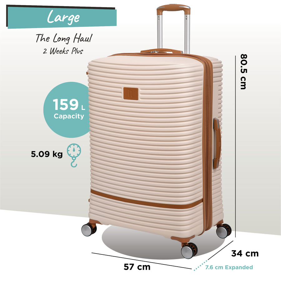 This large case has been designed with a clamshell central opening that helps separate belongings. Multi-stage telescopic trolley system with soft-touch gel grab-handles for comfortable carrying. Finished with a fully-lined interior with large zippered pocket and compression straps.