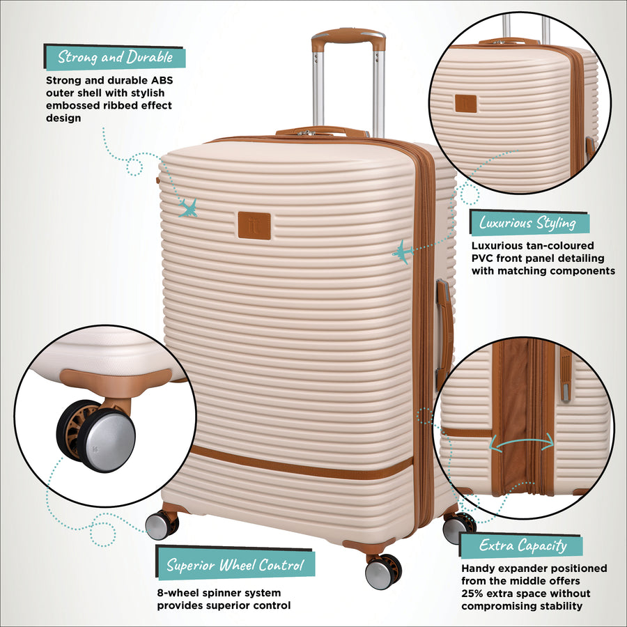 Replicating’s strong and durable ABS shell provides high-resistance protection whilst the unique embossed ribbed effect design with luxurious tan PVC detailing and matching components offers stunning looks.