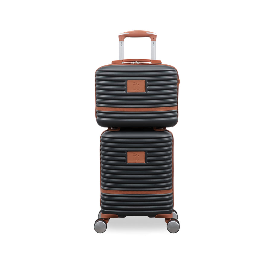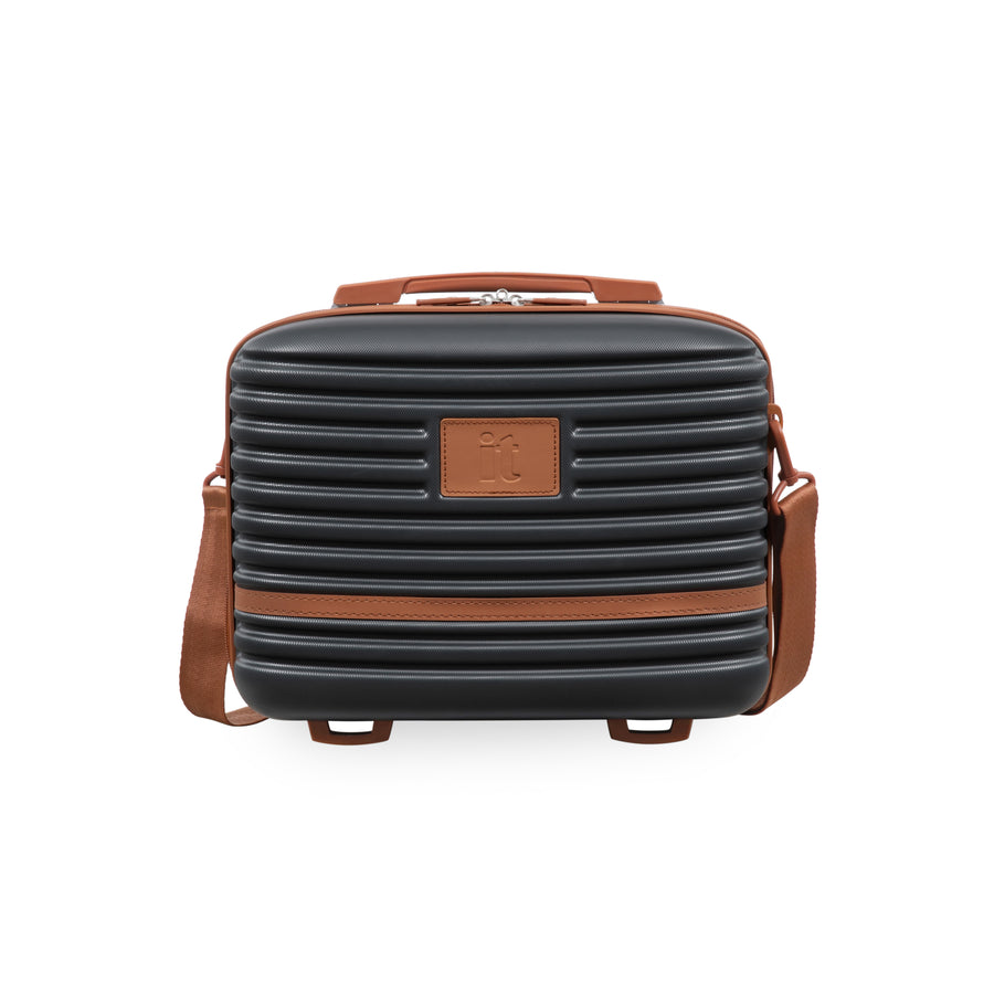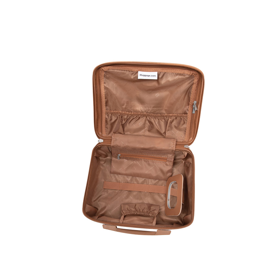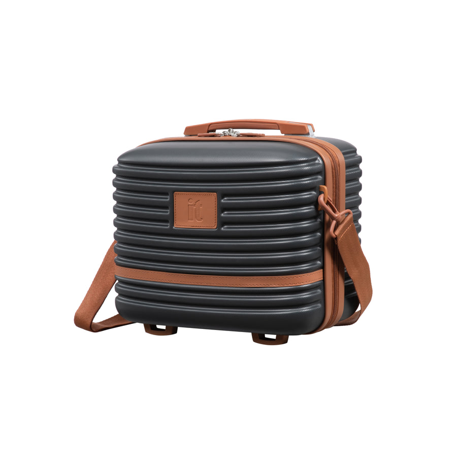 The Replicating vanity case has been constructed from strong and durable ABS outer shell with stylish embossed ribbed effect design. Detailed with Luxurious tan-coloured PVC front panel detailing with matching components.