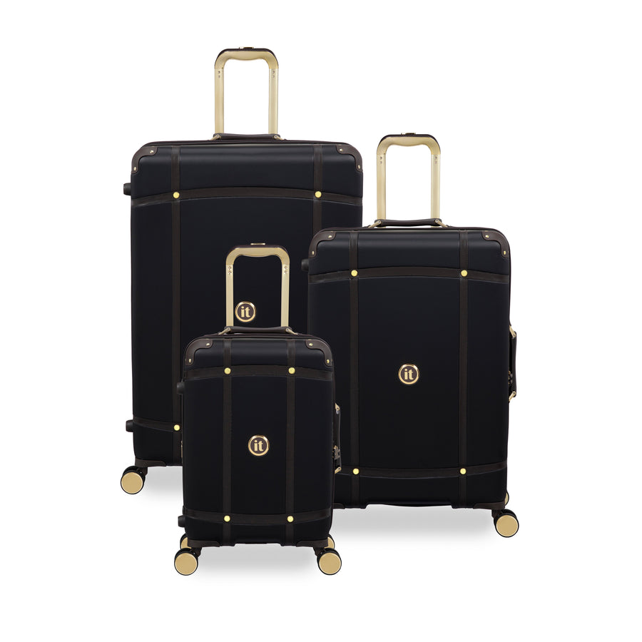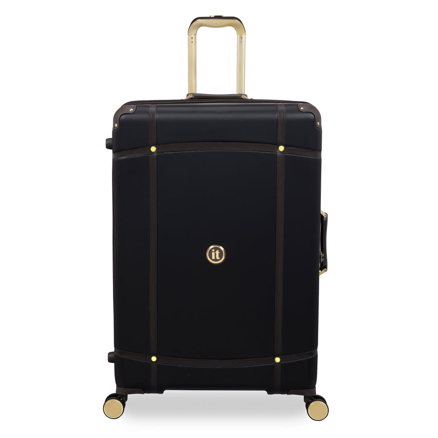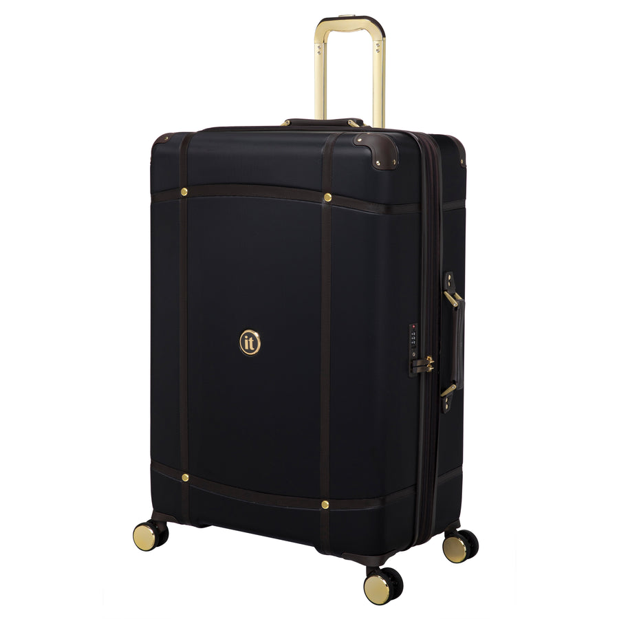 The timeless black finish exudes a classic nostalgic feel and the leather look mulch trim gives the Superiority large suitcase a luxurious look, which is complemented by the gold detailing on the wheels, components and contrast stitching.