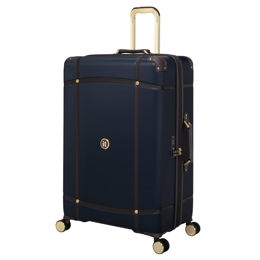 The timeless blueberry finish exudes a classic nostalgic feel and the leather look mulch trim gives the Superiority large suitcase a luxurious look, which is complemented by the gold detailing on the wheels, components and contrast stitching.