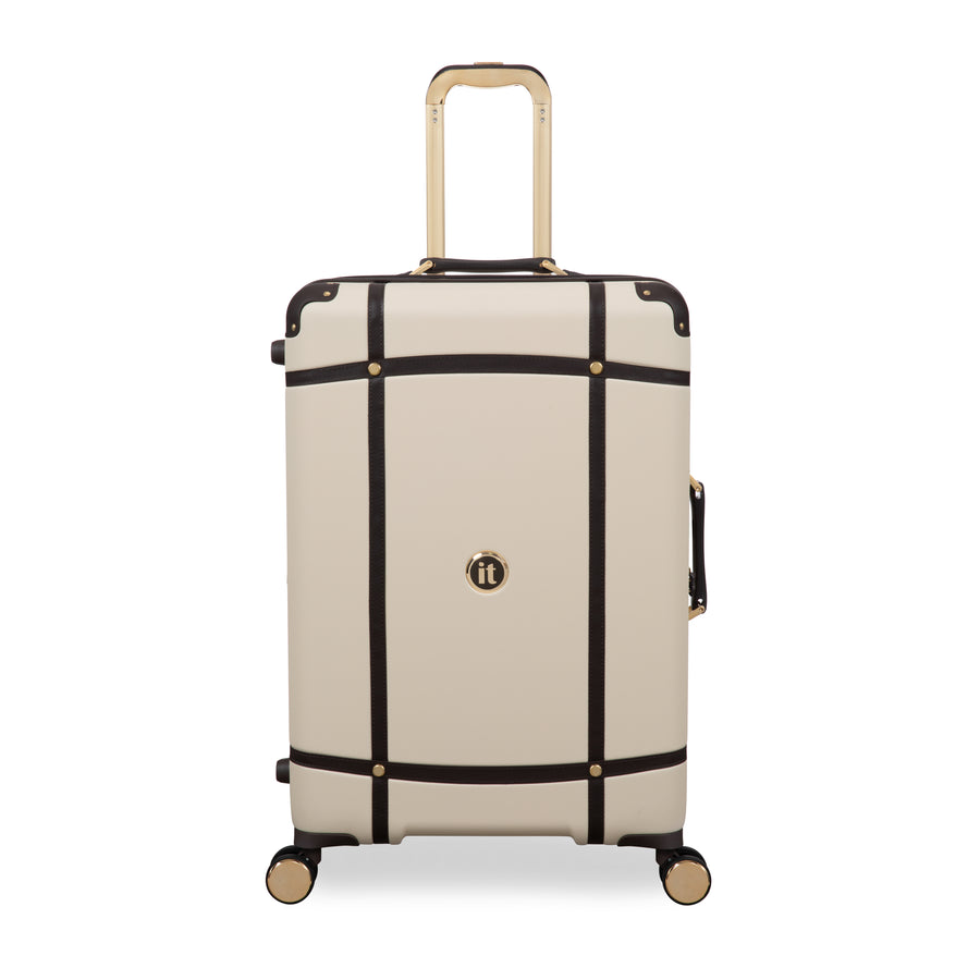 The timeless cream finish exudes a classic nostalgic feel and the leather look mulch trim gives the Superiority medium suitcase a luxurious look, which is complemented by the gold detailing on the wheels, components and contrast stitching.