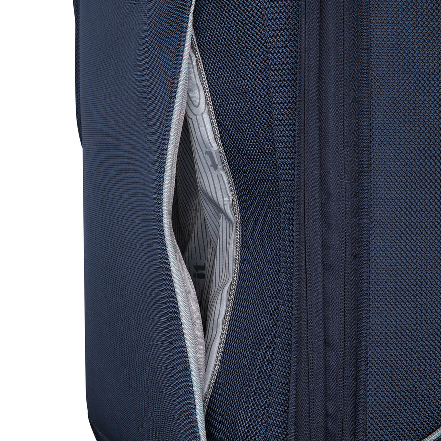 The front panel of the Teleported case features innovative front pockets, which purpose is to hold contents whilst at the same time creating a stylish "cut-out" design with contrasting piping. The design features corner protectors to ensure the case stands up to rigorous travel.