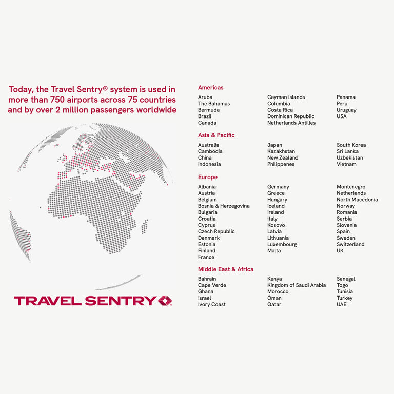 Travel Sentry® and their authorised locks are utilised in over 750 airports across 75 countries, accommodating 2 billion travellers annually. The list of these countries is available at www.travelsentry.org. Notably, Travel Sentry® approved locks are universally accepted, with no exceptions.